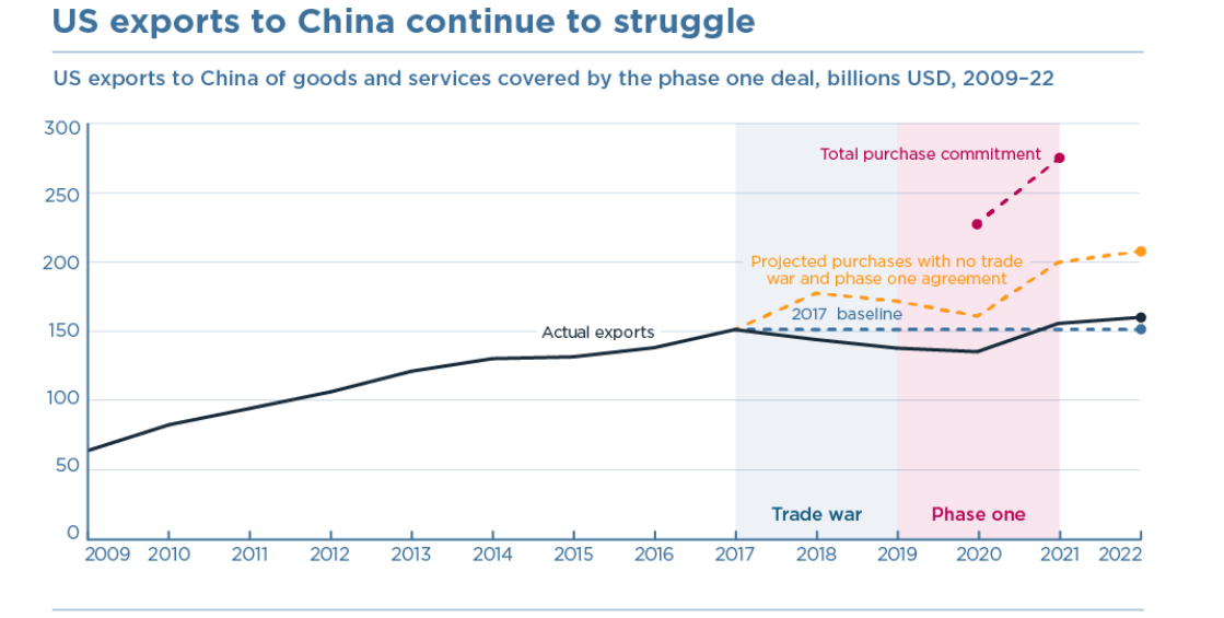 In 2020, a truce was signed between the two, called the Phase One Agreement, where China pledged to increase its imports from the US by 200 USD in two years. However, this target wasn’t reached and this escalated the animosity further (Bown and Wang, 2023).