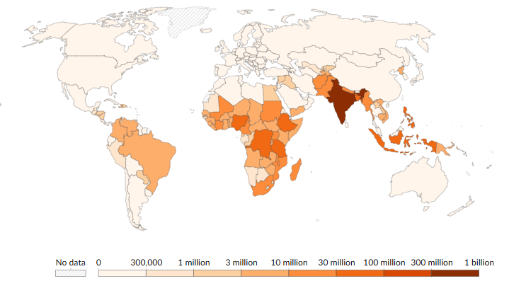 Global burden of NTDs, showing the number of people requiring interventions per country