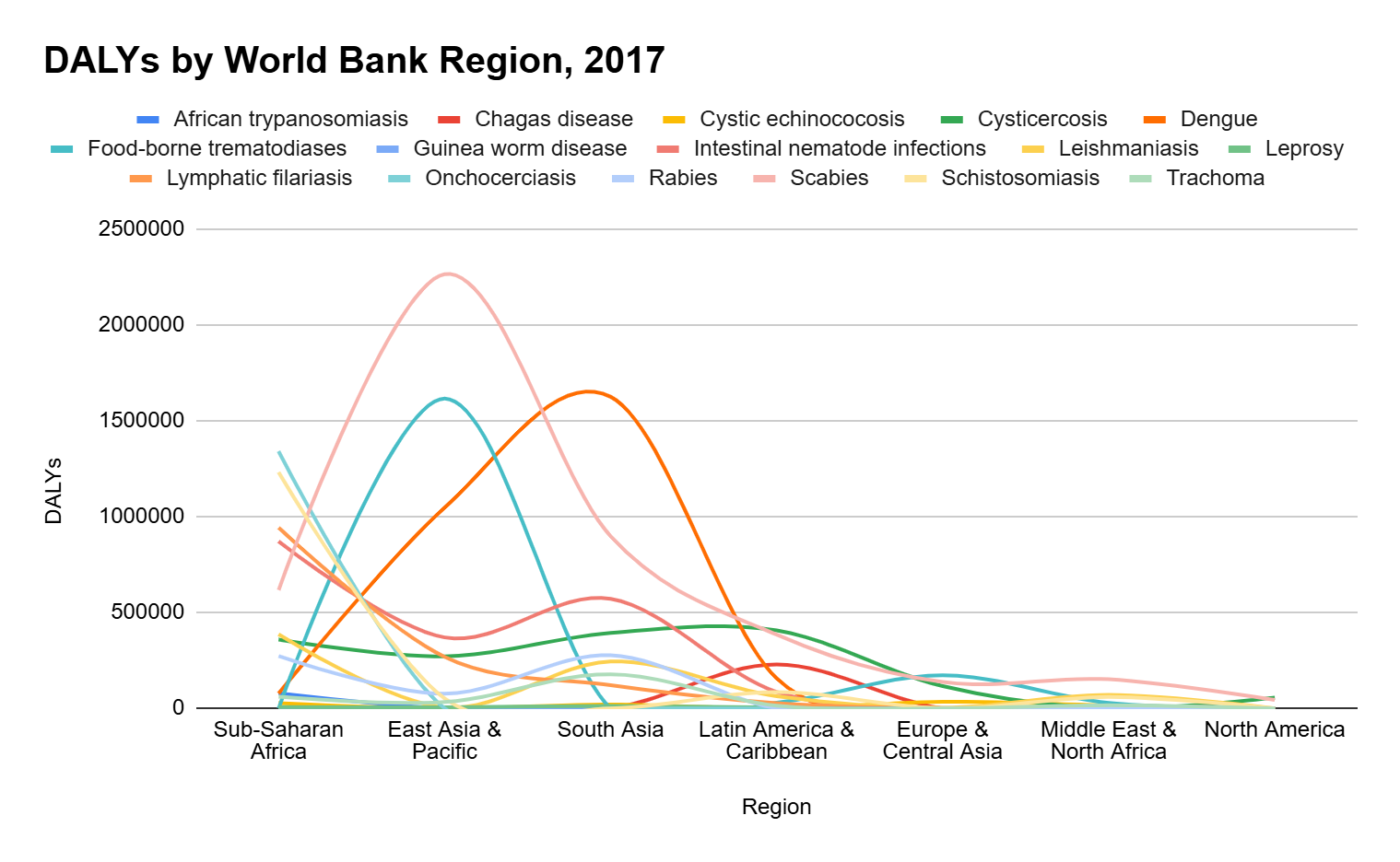 Global burden of neglected tropical diseases (NTDs) by region in 2017, measured in DALYs.