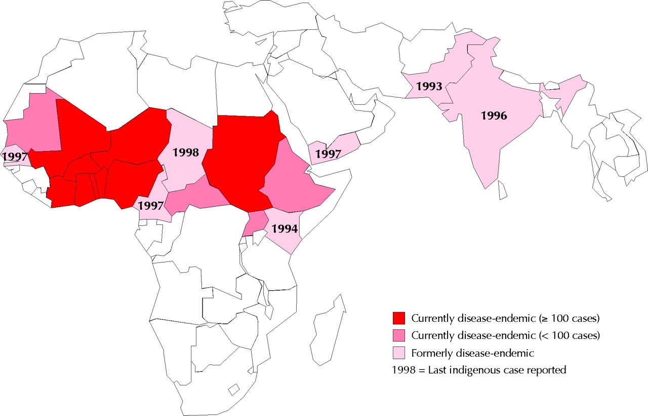 Guinea worm disease (or dracunculiasis) is a parasitic disease currently limited to rural and remote areas of Sub-Saharan countries, as shown in Figure 4, that lack access to basic sanitation. The great majority of its cases are during agricultural peaks, leading to more sick people, a loss in productivity, and, consequently, an economic loss for the region (Greenaway, 2004).